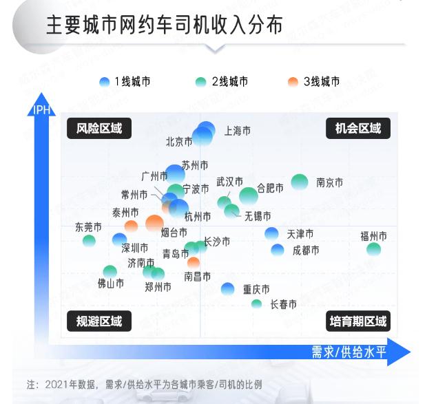1.北上廣、杭州及蘇州是網(wǎng)約車的主力市場,司機(jī)時薪相對高,市場競爭激烈,目前司乘比過低,城市訂單量對收益的保障力度不夠。