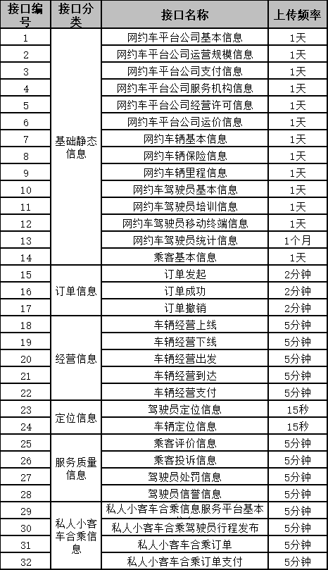 網(wǎng)約車平臺向監(jiān)管平臺接入的各接口數(shù)據(jù)必須按不低于下表規(guī)定的頻率上傳: