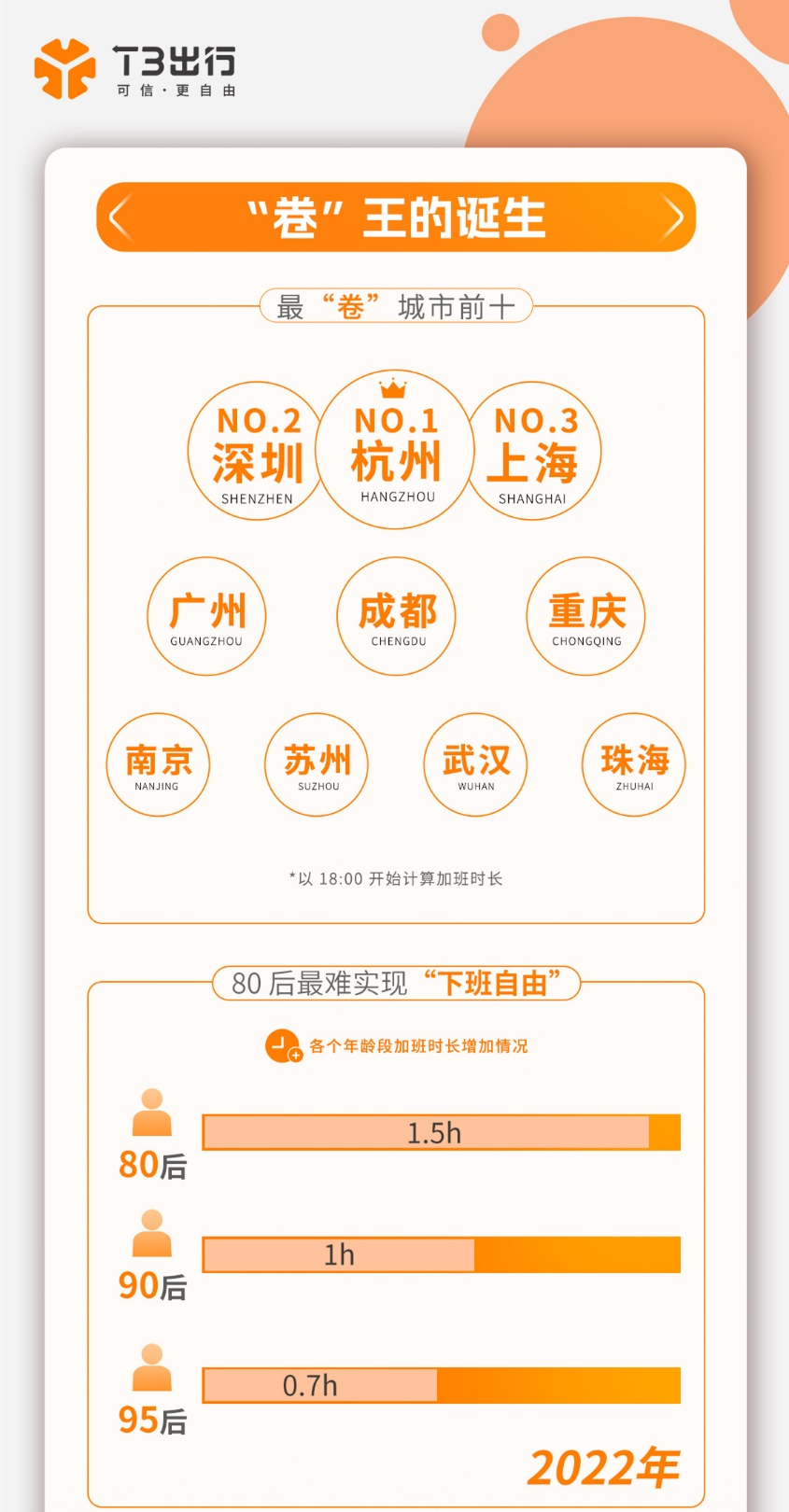 根據(jù)《報(bào)告》統(tǒng)計(jì),以18:00開始計(jì)算加班時(shí)長(zhǎng),杭州是最“卷”的城市,每天平均下班時(shí)間相比2021年晚了1小時(shí),深圳、上海、廣州、成都、重慶、南京、蘇州、武漢、珠海緊隨其后,位列最“卷”城市排行榜第二至第十位。