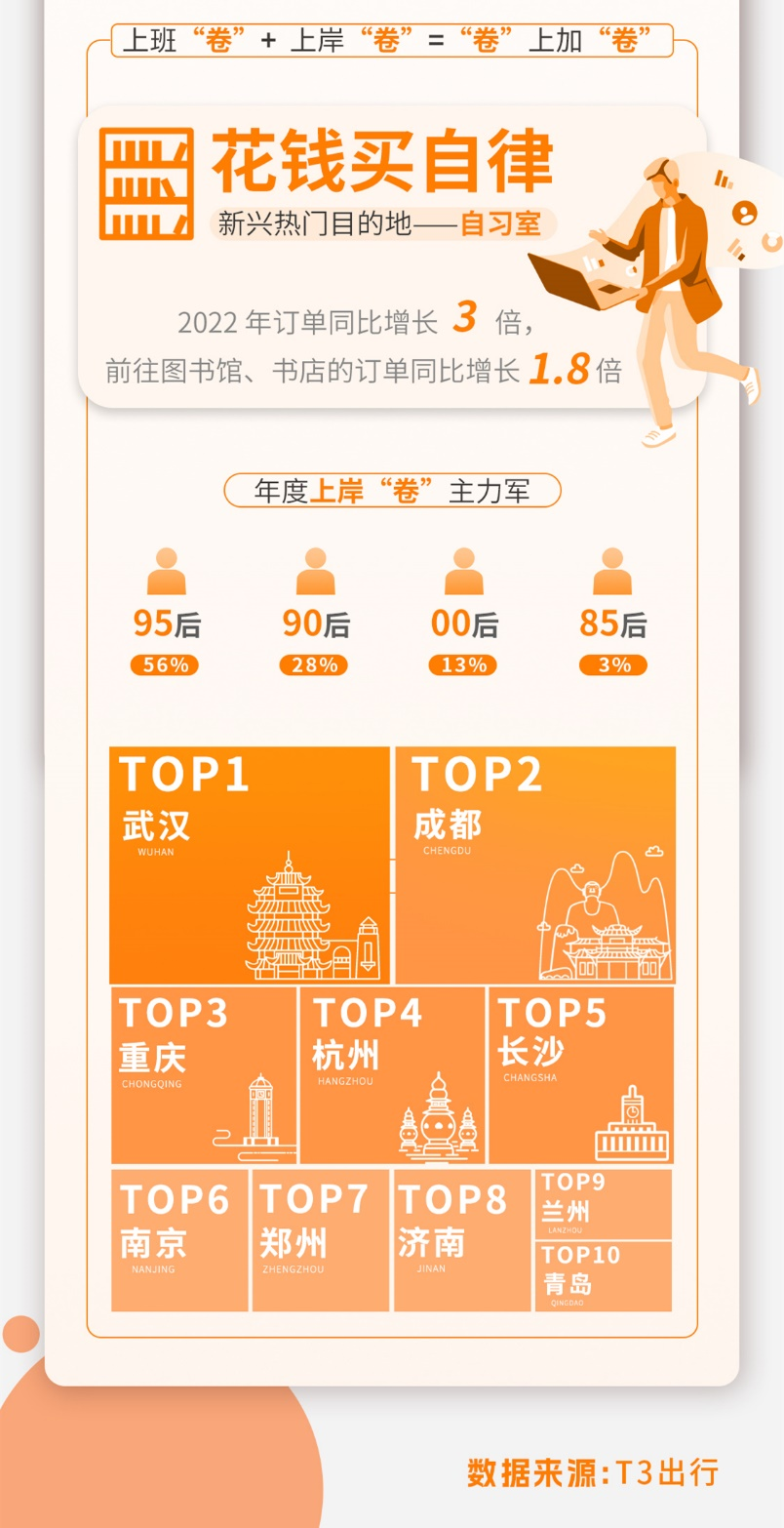 12月28日,T3出行發(fā)布《2022年度出行消費(fèi)報(bào)告》(下稱“報(bào)告”),對(duì)2022年度用戶的出行消費(fèi)特點(diǎn)進(jìn)行盤點(diǎn)。《報(bào)告》顯示,53%的用戶打車頻次同比增加,上下班通勤超越休閑娛樂成為首要打車需求。95后等年輕群體則熱衷前往收費(fèi)自習(xí)室、圖書館等場(chǎng)所備考,令前往自習(xí)室的訂單同比增幅達(dá)300%。