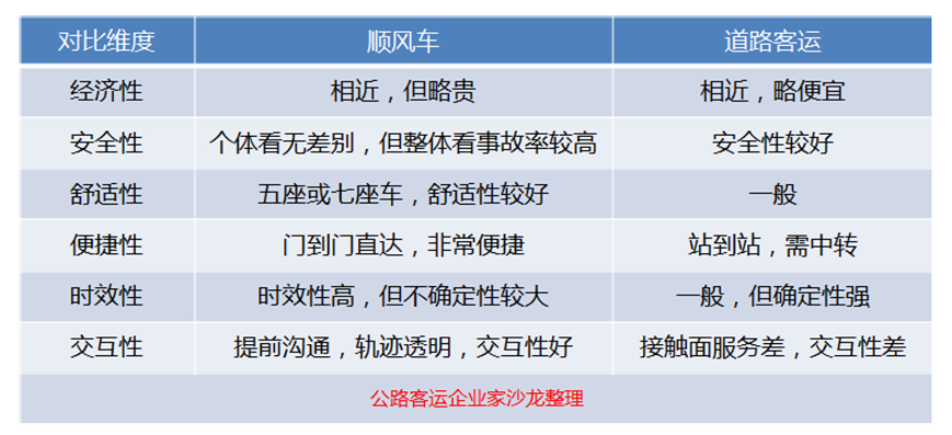 這里姑且認為這個理由是成立的,那么,我們更正為比較下道路客運產(chǎn)品與服務(wù)和順風車之間的不一樣。哪些是順風車的強項和優(yōu)勢,哪些是弱項和劣勢。如此,在道路客運行業(yè)對著順風車一直喊著狼來了,才有喊出來的底氣。
