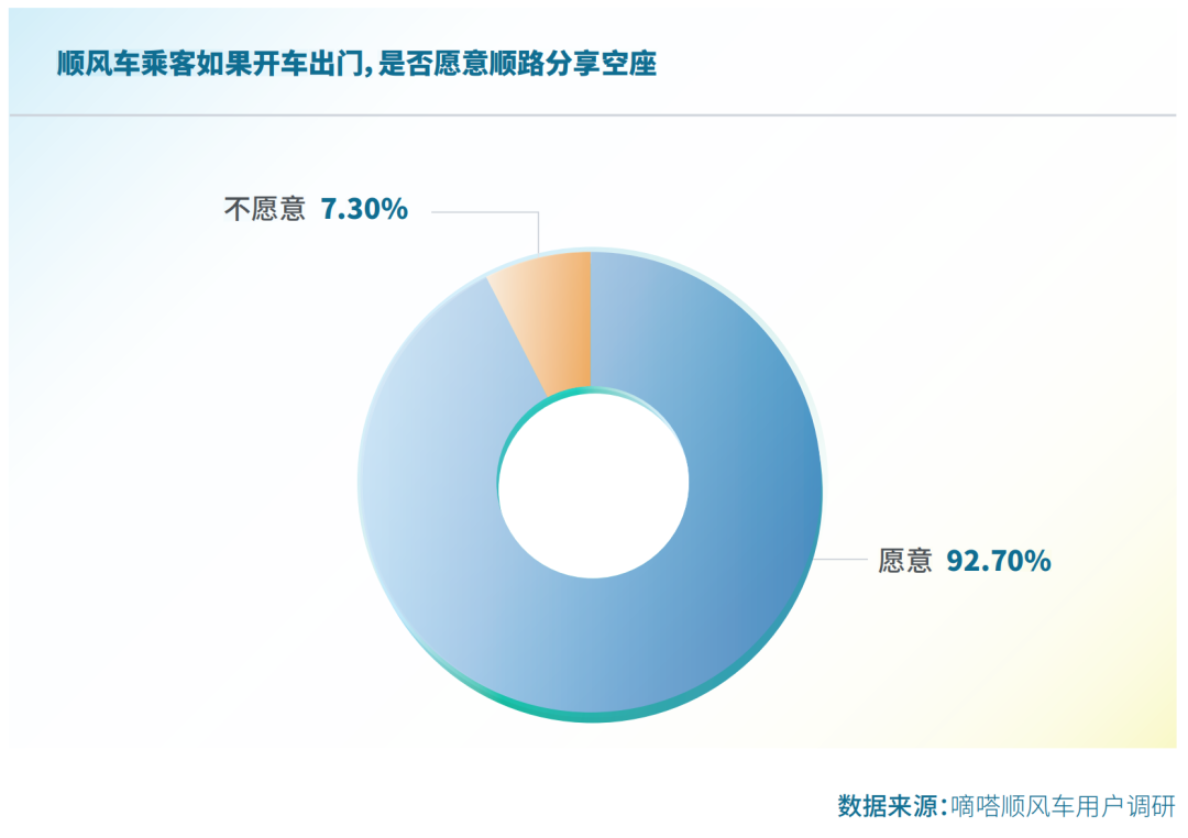 基于嘀嗒順風車用戶調研中:92.7%的受訪順風車乘客表示,如今后開車出門,愿意順路分享空座。這表明,在持續(xù)搭乘順風車過程中,越來越多乘客的主動分享意識也在逐漸提升。