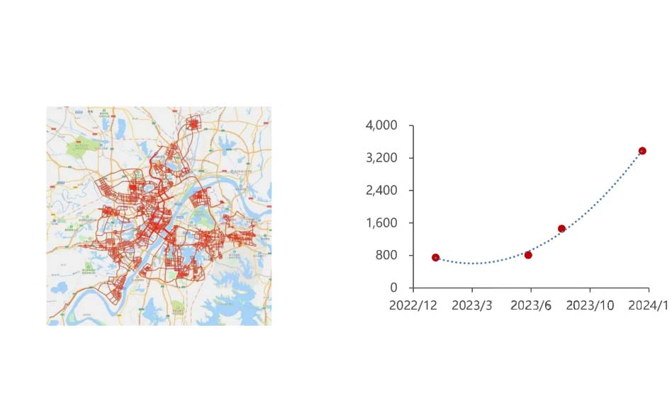 政策大力支持,測試道路里程快速增長。2019年9月22日,國家智能網(wǎng)聯(lián)汽車(武漢)測試示范區(qū)正式揭牌,是國內(nèi)第六、中部首個(gè)國家級智能網(wǎng)聯(lián)汽車測試示范區(qū)。示范區(qū)揭牌以來,測試道路里程快速增長,一期測試道路全長僅為28公里,2023年以來武漢市智能網(wǎng)聯(lián)汽車測試道路持續(xù)擴(kuò)容,開放里程快速增長。截至2023年底,智能網(wǎng)聯(lián)汽車開放測試道路突破3,378.73公里(單向里程),輻射面積約3,000平方公里,觸達(dá)人口超770萬人,開放里程和開放區(qū)域數(shù)保持全國第一。