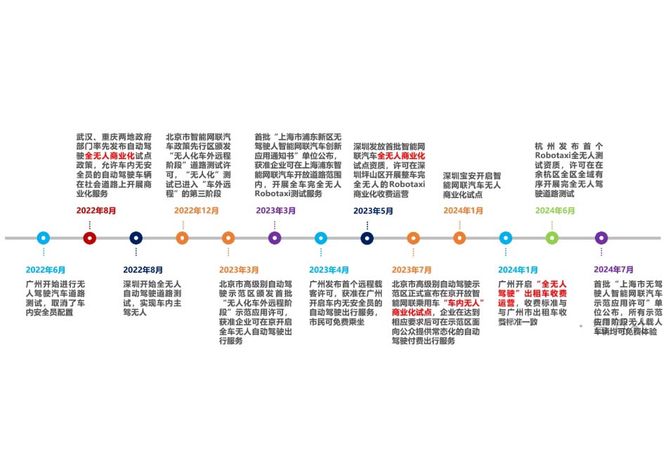 武漢、重慶、深圳、廣州已先后進(jìn)入全無人商業(yè)化試點(diǎn)階段:1)2022年8月,武漢、重慶兩地政府部門率先發(fā)布自動駕駛?cè)珶o人商業(yè)化試點(diǎn)政策;2)2023年5月,深圳發(fā)放首批智能網(wǎng)聯(lián)汽車全無人商業(yè)化試點(diǎn)資質(zhì);3)2023年7月,北京開發(fā)智能網(wǎng)聯(lián)乘用車“車內(nèi)無人”商業(yè)化試點(diǎn);4)2024年1月,廣州開啟“全無人駕駛”出租車收費(fèi)運(yùn)營。