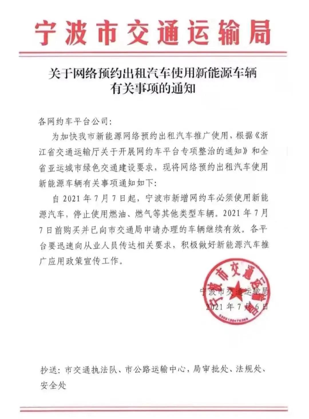 寧波市交通運(yùn)輸局對(duì)各網(wǎng)約車(chē)平臺(tái)公司下發(fā)的這份《關(guān)于網(wǎng)絡(luò)預(yù)約出租汽車(chē)使用新能源車(chē)輛有關(guān)事項(xiàng)的通知》要求,自2021年7月7日起,寧波市新增網(wǎng)約車(chē)必須使用新能源汽車(chē),停止使用燃油、燃?xì)獾绕渌?lèi)型車(chē)輛。此前購(gòu)買(mǎi)并已向市交通局申請(qǐng)辦理的車(chē)輛繼續(xù)有效。
